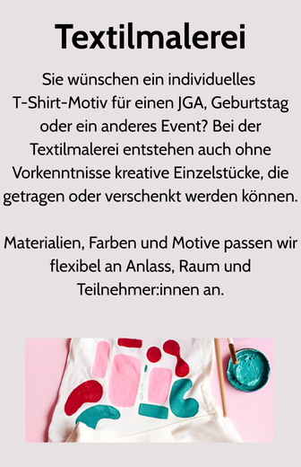 Die gemeinsame künstlerische Arbeit lädt dazu ein, Neues auszuprobieren, miteinander ins Gespräch zu kommen und für einen Moment in eine andere Welt einzutauchen. Eine inspirierende Bereicherung für jedes Eventprogramm.